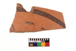 | Description / विवरण | A specimen of a potsherd. It is reddish in colour with black decorative geometric painting on it. |