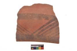| Description / विवरण | Specimen of black on red ware with decorative geometric Groups of oblique strokes set in horizontal bands on the exterior painting. |