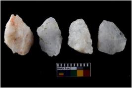 | Description / विवरण | There are n-4 of intact flake cores made up of Quartz. Some of them have bulge of percussion and some are flat flakes. |