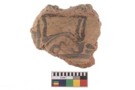 | Description / विवरण | A fragment of a potsherd. It is reddish in colour with black decorative geometric painting on it. |