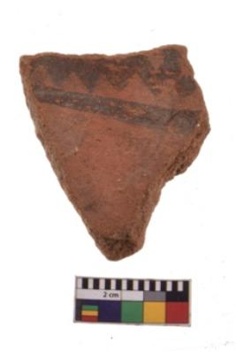 | Description / विवरण | Specimen of black on red ware with decorative geometric A row of arches over a horizontal band painting. |