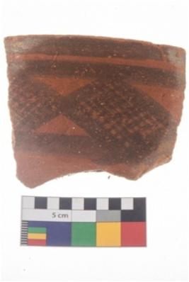 | Description / विवरण | Specimen of potsherd with black decorative geometric diamond set broad horizontal bands painting . |