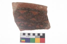 | Description / विवरण | Specimen of potsherd with black decorative geometric diamond set broad horizontal bands painting . |