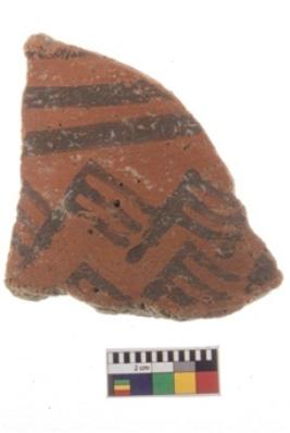 | Description / विवरण | A fragment of a potsherd. It is reddish in colour with black decorative geometric painting on it. |