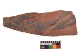 | Description / विवरण | Specimen of black on red ware with decorative geometric Its decorated with two horizontal bands with sets of triple arches painting. |