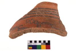 | Description / विवरण | A specimen of a potsherd. It is reddish in colour with black decorative animal painting on it. |