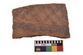 | Description / विवरण | Specimen of black on red ware with decorative geometric Two horizontal bands containing criss-cross pattern painting. |