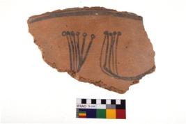 | Description / विवरण | A specimen of a potsherd. It is reddish in colour with black decorative geometric painting on it. |