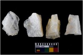 | Description / विवरण | There are n-4 of intact flake cores made up of Quartz. Some of them have bulge of percussion and some are flat flakes. |