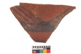 | Description / विवरण | Specimen of potsherd with decorative geometric Linear painting, Type Black on Red Ware . |