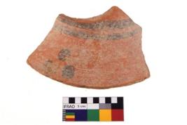 | Description / विवरण | A specimen of a potsherd. It is reddish in colour with black decorative geometric painting on it. |