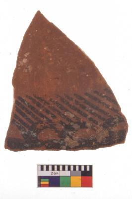 | Description / विवरण | Specimen of Potsherd black on red painted pottery. It is fine fabric in sharp contrast with painted design are executed in black pigment. |