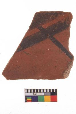 | Description / विवरण | Specimen of Potsherd black on red painted pottery. It is fine fabric in sharp contrast with painted design are executed in black pigment. |