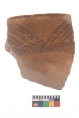 | Description / विवरण | Specimen of potsherd black on red painted pottery. It is fine fabric in sharp contrast with painted design are executed in black pigment. |