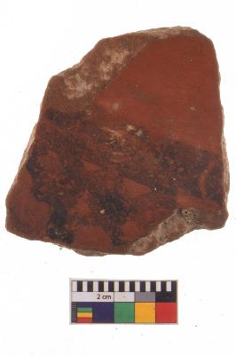 | Description / विवरण | Specimen of Potsherd black on red painted pottery. It is fine fabric in sharp contrast with painted design are executed in black pigment. |