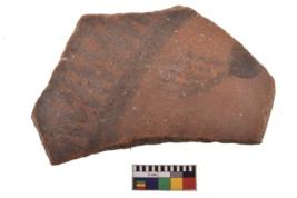 | Description / विवरण | Specimen of black on red ware with decorative geometric A row of arches over a horizontal band painting. |