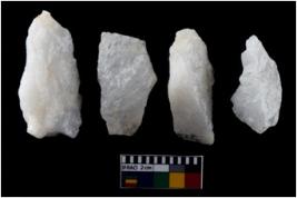 | Description / विवरण | There are n-4 of intact flake cores made up of Quartz. Some of them have bulge of percussion and some are flat flakes. |