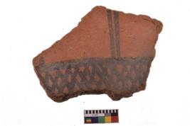 | Description / विवरण | Specimen of black on red ware with decorative geometric Two horizontal bands containing criss-cross pattern painting. |