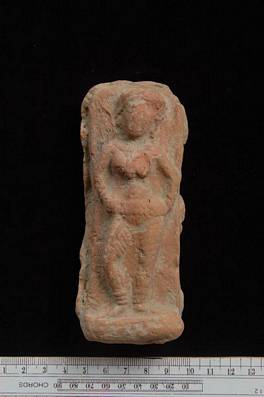 | Description / विवरण | Terracotta plaque containing a standing female figure keeping both of her hands on the waist. One breast and face damaged. |