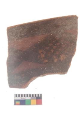 | Description / विवरण | Specimen of potsherd with black decorative geometric diamond set broad horizontal bands painting . |
