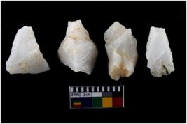 | Description / विवरण | There are n-4 of intact flake cores made up of Quartz. Some of them have bulge of percussion and some are flat flakes. |