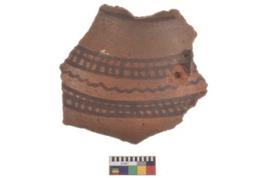 | Description / विवरण | Specimen of black on red ware with decorative geometric Group of vertical lines with horizontal strokes painting. |