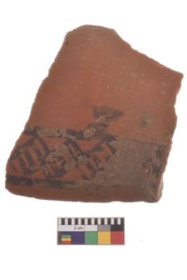 | Description / विवरण | Specimen of black on red ware with decorative geometric Flag design to left painting. |