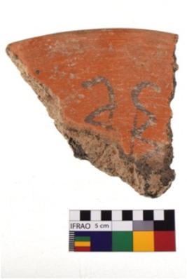 | Description / विवरण | A specimen of a potsherd. It is reddish in colour with black decorative geometric painting on it. |