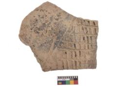 | Description / विवरण | Specimen with engraved crisss-cross lines and rough surface. |