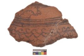 | Description / विवरण | Specimen of black on red ware with decorative geometric Design resembling elongated S jointed by loops painting. |