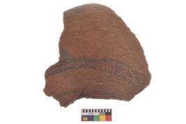 | Description / विवरण | Specimen of black on red ware with decorative geometric Stroked loops painting. |