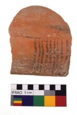 | Description / विवरण | A specimen of a potsherd. It is reddish in colour with black decorative geometric painting on it. |