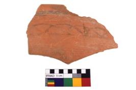 | Description / विवरण | A specimen of a potsherd. It is reddish in colour with black decorative geometric painting on it. |