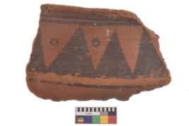 | Description / विवरण | Specimen of black on red ware with decorative geometric Solid trangles with empty circles in between painting. |