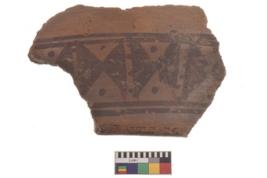 | Description / विवरण | Specimen of black on red ware with decorative geometric Horizontal double axe design with dots in between painting. |