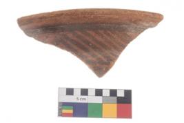 | Description / विवरण | Specimen of potsherd with black decorative geometric painting . |