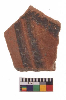 | Description / विवरण | Specimen of Potsherd black on red painted pottery. It is fine fabric in sharp contrast with painted design are executed in black pigment. |