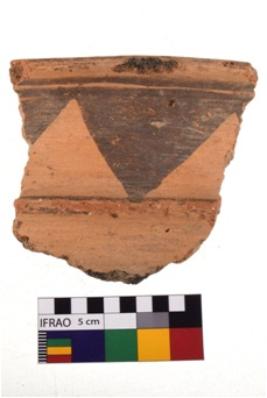 | Description / विवरण | A specimen of a potsherd. It is reddish in colour with black decorative geometric painting on it. |
