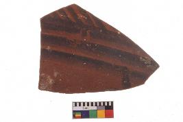 | Description / विवरण | Specimen of Potsherd black on red painted pottery. It is fine fabric in sharp contrast with painted design are executed in black pigment. |