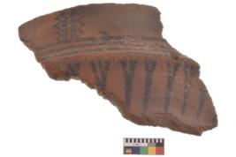 | Description / विवरण | Specimen of black on red ware with decorative geometric Straight sided belly, another carination below belley, externally having a design of bisected trangles painting. |