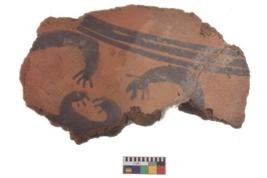 | Description / विवरण | Specimen of black on red ware with decorative geometric Snail motif painting. |