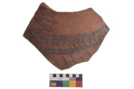 | Description / विवरण | Specimen of black on red ware with decorative geometric A row of arches over a horizontal band painting. |