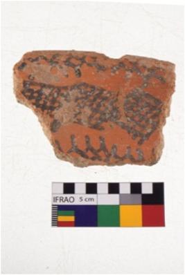 | Description / विवरण | A specimen of a potsherd. It is reddish in colour with black decorative geometric and animal painting on it. |