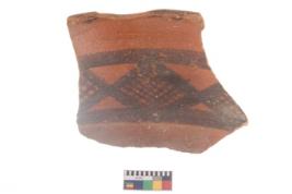 | Provenance / उद्गम/क्षेत्र | Specimen of potsherd with black decorative geometric diamond set broad horizontal bands painting |