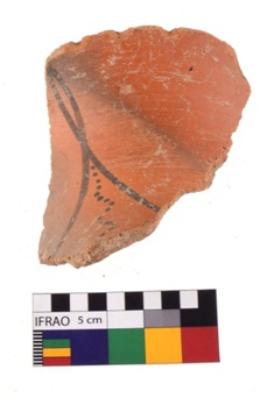| Description / विवरण | A specimen of a potsherd. It is reddish in colour with black decorative geometric painting on it. |
