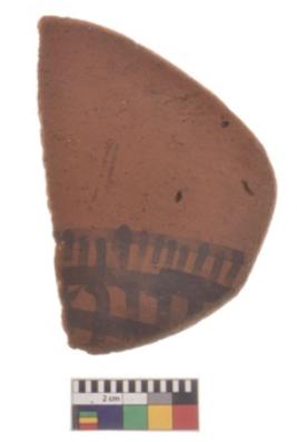 | Description / विवरण | Specimen of black on red ware with decorative geometric Two vertical strokes set in three horizontal bands painting. |