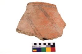 | Description / विवरण | A specimen of a potsherd. It is reddish in colour with black decorative geometric painting on it. |