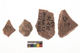 | Description / विवरण | It made up of a short flakes with sides trimmed. Marks of secondary flaking are present on the both the faces. It rained pebbly cortex on one side and irregular thin edge on the other. The dorsal is relatively flat. A patch of cortex near the section which is slanting to the dorsal .It is sub rectangular in shaped. |