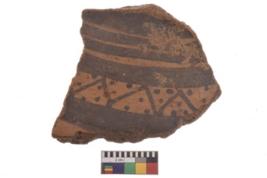 | Description / विवरण | Specimen of black on red ware with decorative geometric Suspended inverted tringles, pattern decorated with alternate dotting painting. |