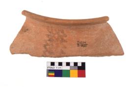 | Description / विवरण | A specimen of a potsherd. It is reddish in colour with black decorative geometric painting on it. |